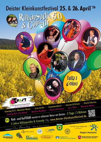 Im bewährten Stil wird es zur Zeit der Rapsblüte entlang einer malerischen 13 km langen Route am Deister auf fünf Bühnen stündlich die vielfältigsten Shows geben - kabarettistisch - komödiantisch - musikalisch - magisch - atemberaubend - akrobatisch - künstlerisch - poetisch - sympathisch - tiefsinnig ... einfach bunt!!!