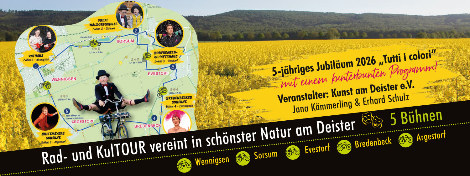 Im bewährten Stil wird es zur Zeit der Rapsblüte entlang einer malerischen 13 km langen Route am Deister auf fünf Bühnen stündlich die vielfältigsten Shows geben - kabarettistisch - komödiantisch - musikalisch - atemberaubend - akrobatisch - überraschend - albern - poetisch - sympatisch - tiefsinnig ... einfach toll!!! Die Künstler*innen der Jubiläumsausgabe verraten wir bald an dieser Stelle.