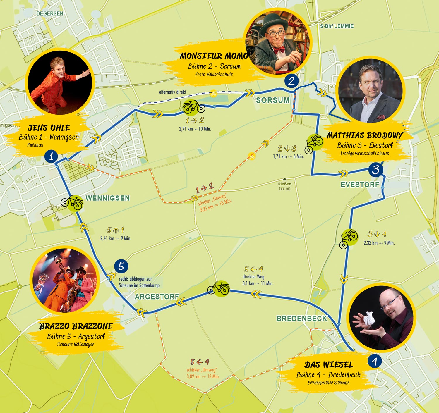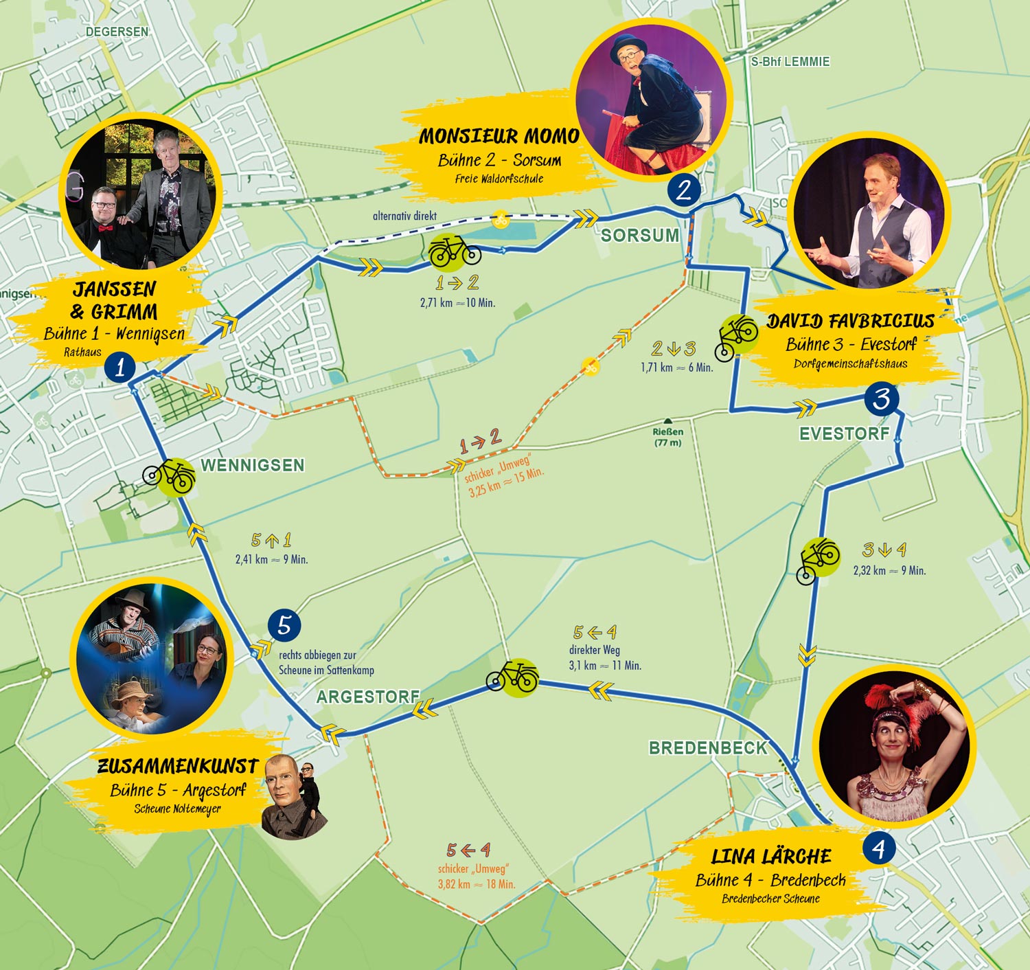 1) Wennigsen, Rathaus – 2) Sorsum, Waldorfschule – 3) Evestorf, DGH – 4) Bredenbecker Scheune – 5) Argestorf, Scheune Bauer Noltemeyer … pro Bühne stündlich Showtime